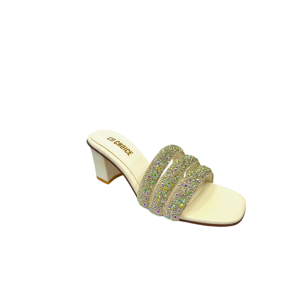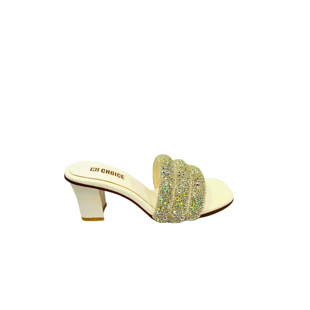Step into elegance with our Peach & White Crystal Embellished Block Heel Slippers, designed to bring glamour and comfort together. Featuring three shimmering crystal-studded straps and a soft peach base, these heels add the perfect sparkle to your festive and formal looks. The mid-block heel provides excellent balance and support, making them ideal for long wear at weddings, parties, or special occasions.